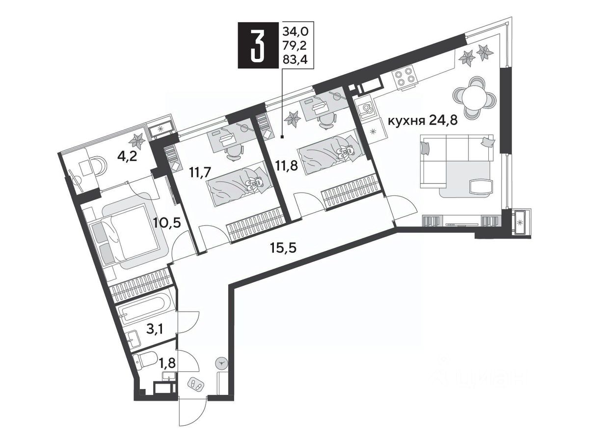 Срок сдачи: 1 кв. 2026, общей площадью 83.4 кв.м., на 11 этаже.
