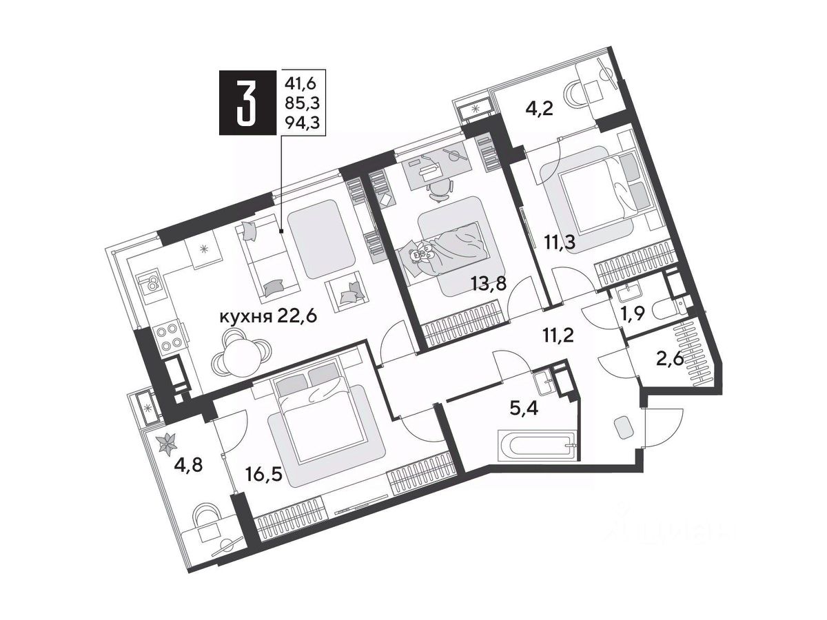 Срок сдачи: 1 кв. 2026, общей площадью 94.3 кв.м., на 12 этаже.