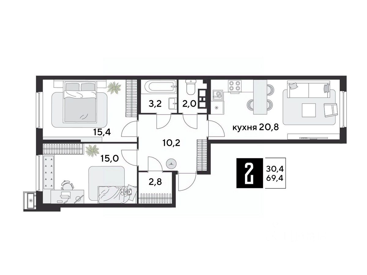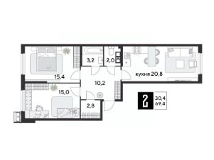 Срок сдачи: 1 кв. 2026, общей площадью 69.4 кв.м., на 8 этаже.