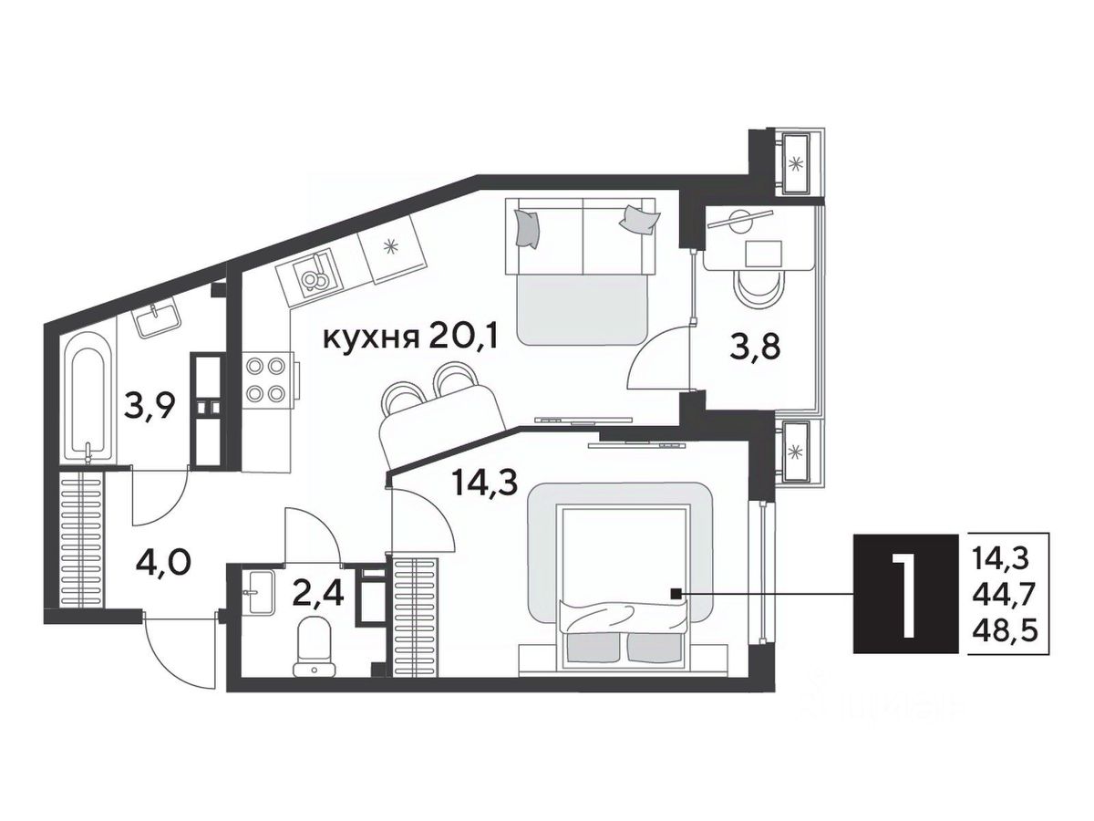 Срок сдачи: 1 кв. 2026, общей площадью 48.5 кв.м., на 12 этаже.