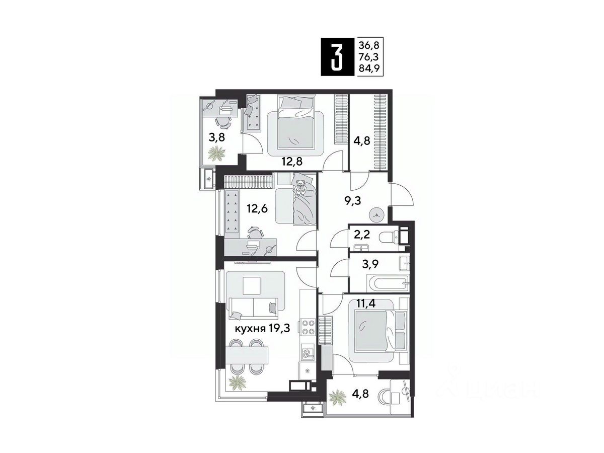 Срок сдачи: 1 кв. 2026, общей площадью 84.9 кв.м., на 12 этаже.