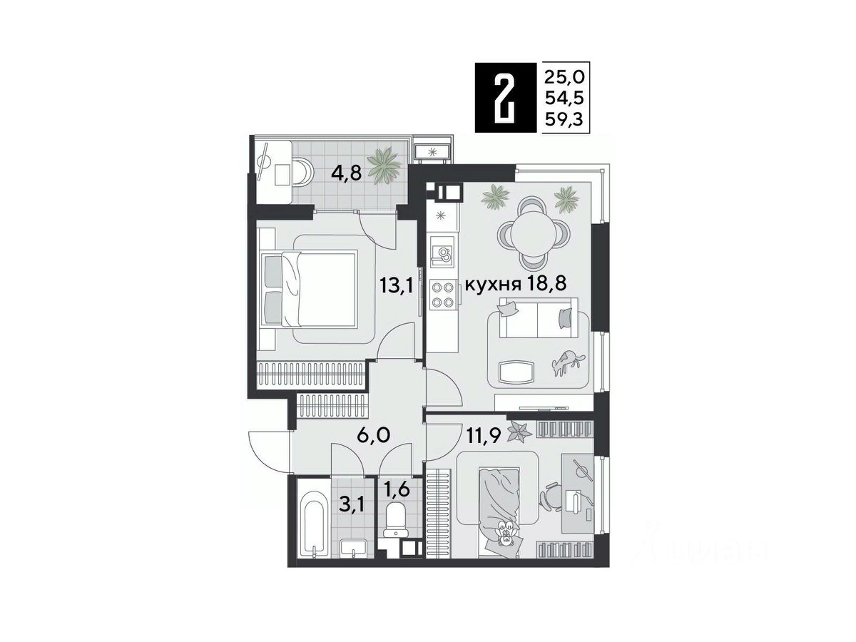 Срок сдачи: 1 кв. 2026, общей площадью 59.3 кв.м., на 6 этаже.