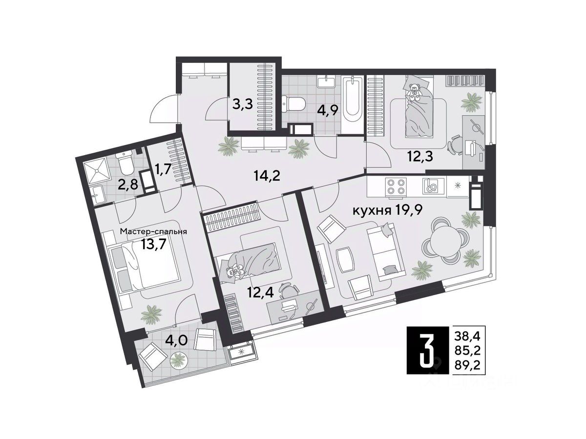 Срок сдачи: 1 кв. 2026, общей площадью 89.2 кв.м., на 13 этаже.