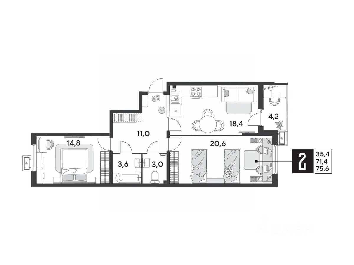 Срок сдачи: 1 кв. 2026, общей площадью 75.6 кв.м., на 2 этаже.