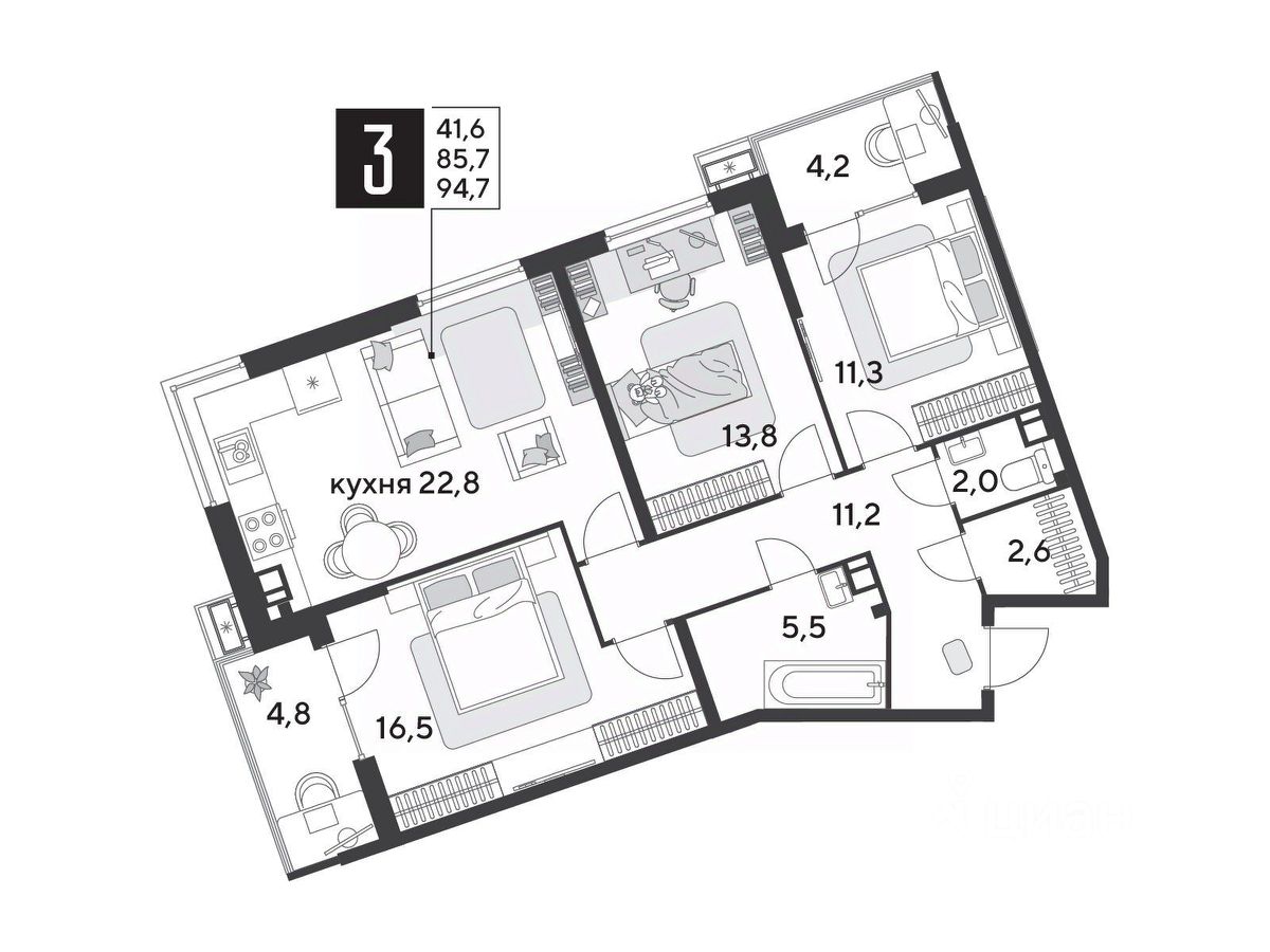 Срок сдачи: 1 кв. 2026, общей площадью 94.7 кв.м., на 9 этаже.