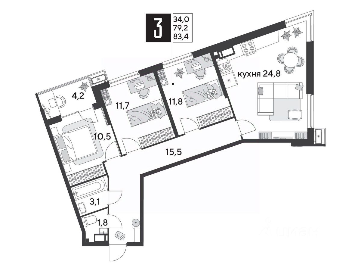 Срок сдачи: 1 кв. 2026, общей площадью 83.4 кв.м., на 12 этаже.