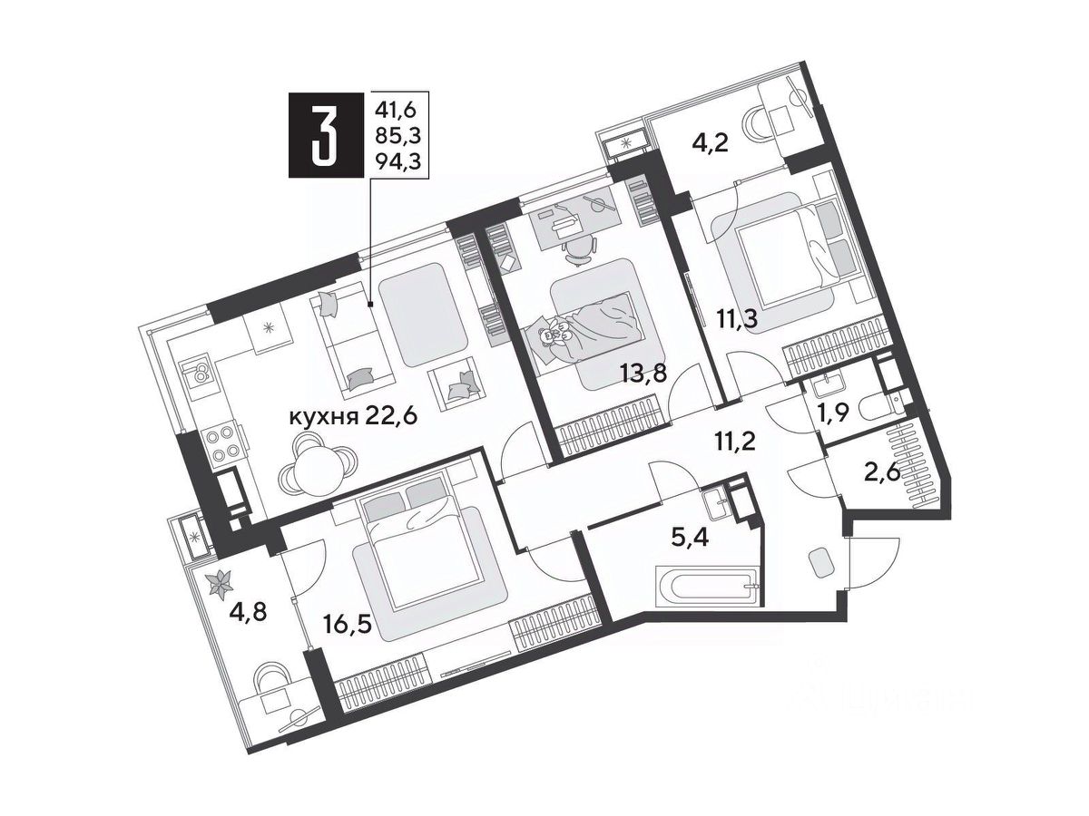 Срок сдачи: 1 кв. 2026, общей площадью 94.3 кв.м., на 16 этаже.