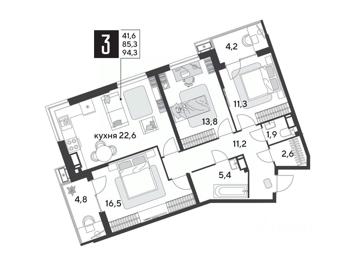 Срок сдачи: 1 кв. 2026, общей площадью 94.3 кв.м., на 15 этаже.