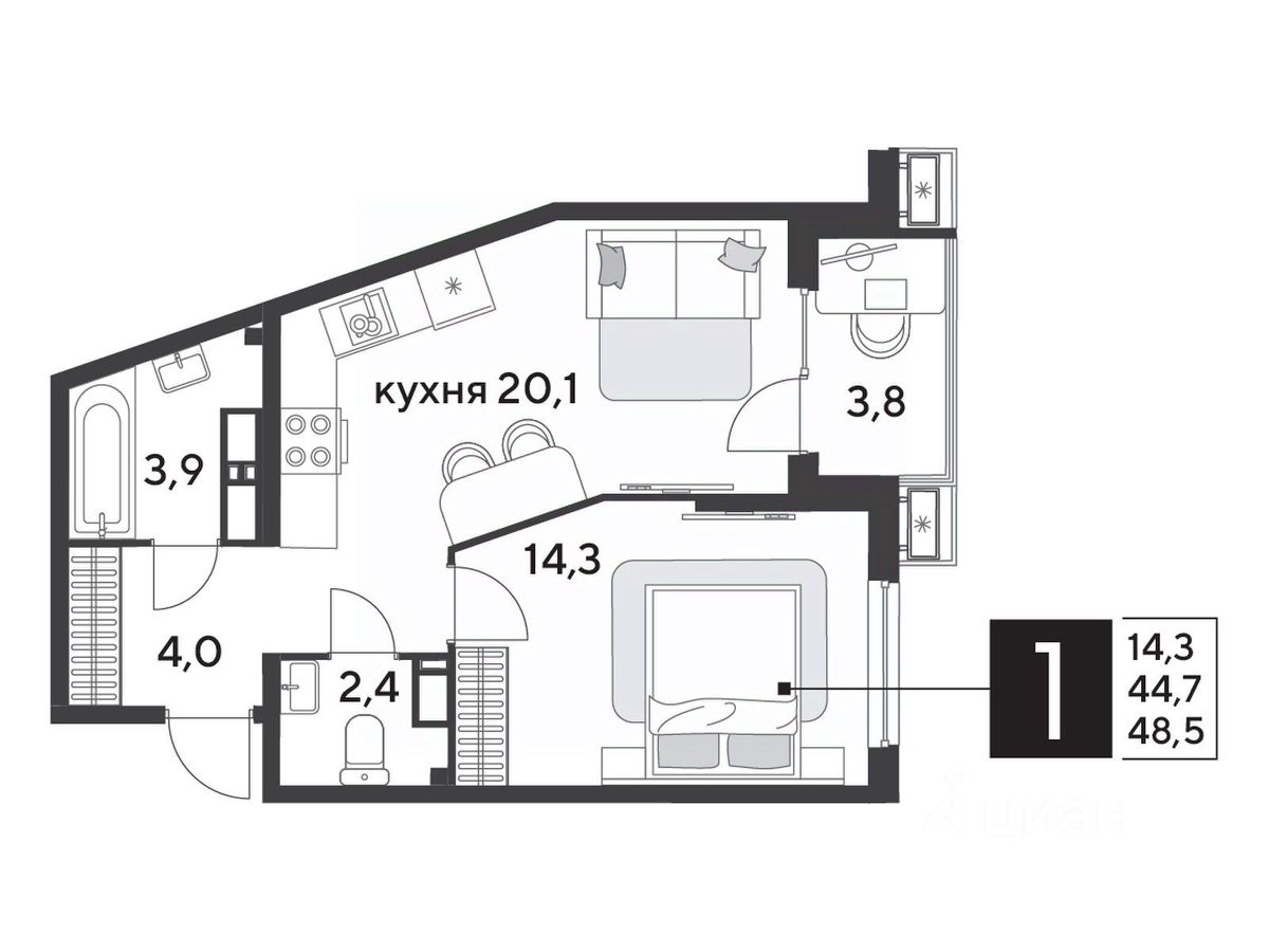 Срок сдачи: 1 кв. 2026, общей площадью 48.5 кв.м., на 18 этаже.