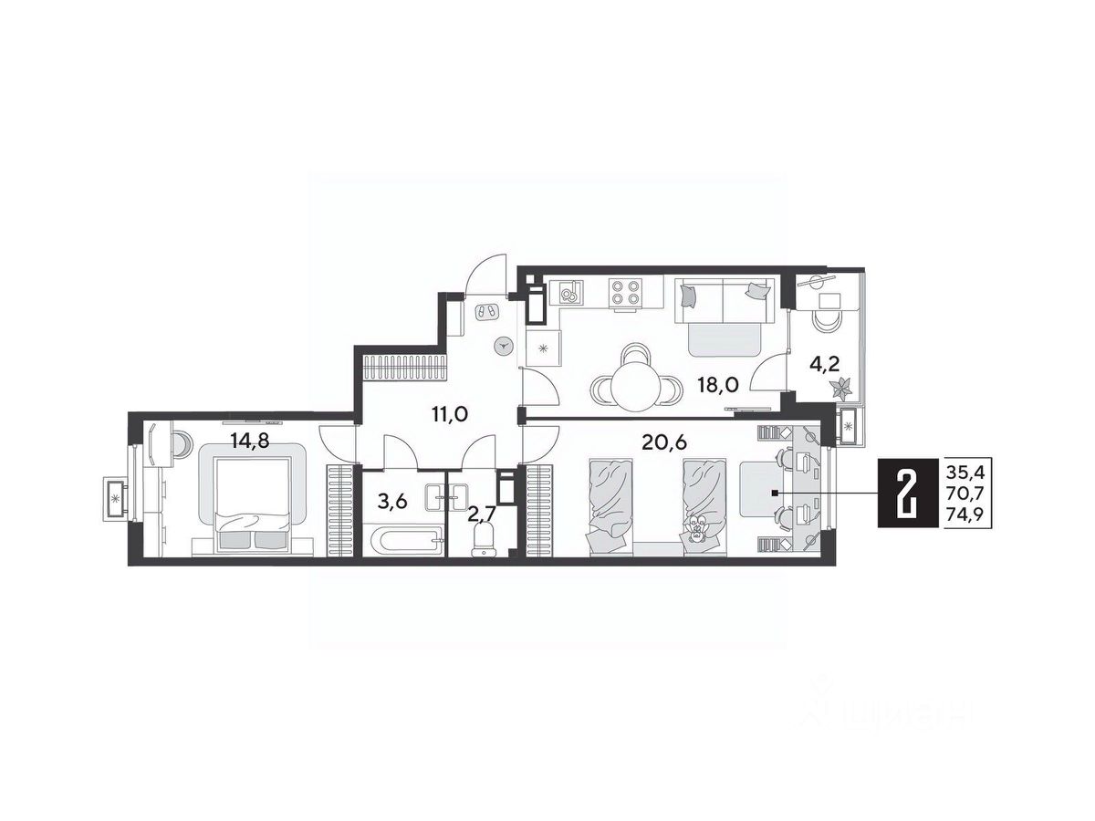 Срок сдачи: 1 кв. 2026, общей площадью 74.9 кв.м., на 18 этаже.