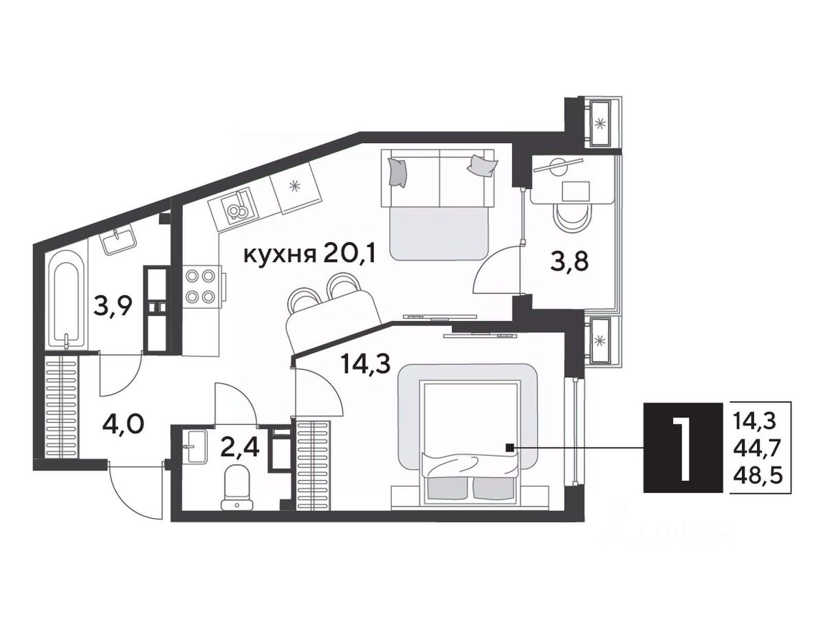 Срок сдачи: 1 кв. 2026, общей площадью 48.5 кв.м., на 14 этаже.