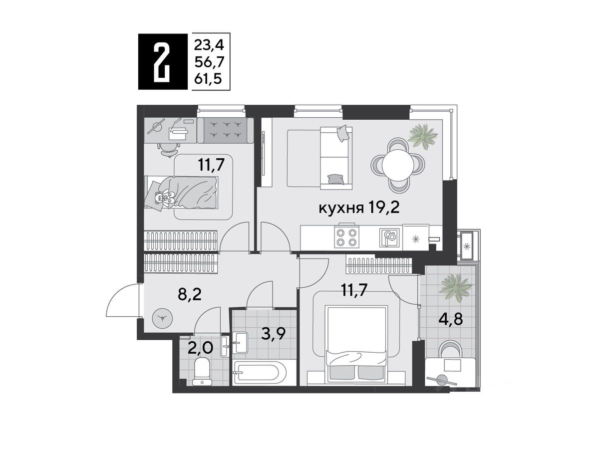 Срок сдачи: 1 кв. 2026, общей площадью 61.5 кв.м., на 2 этаже.