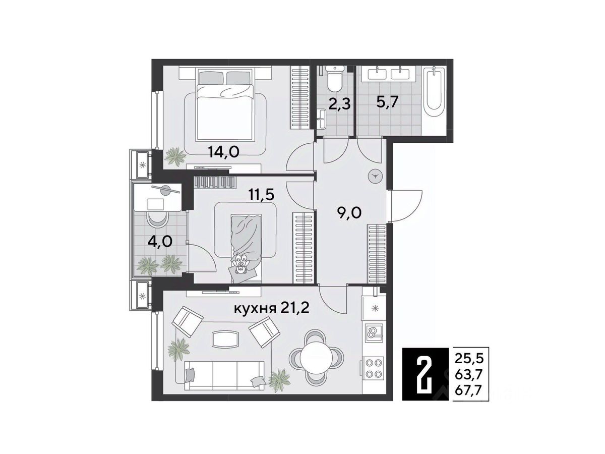 Срок сдачи: 1 кв. 2026, общей площадью 67.7 кв.м., на 2 этаже.