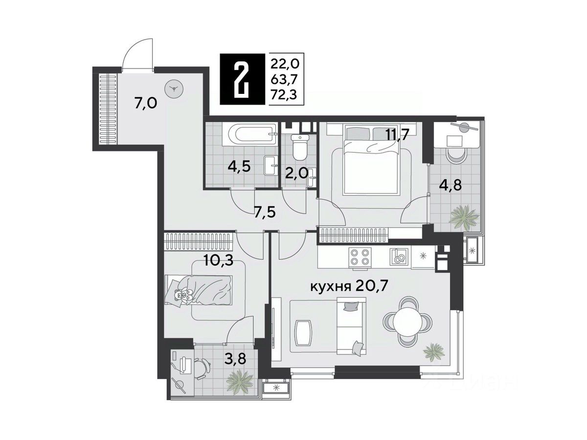 Срок сдачи: 1 кв. 2026, общей площадью 72.3 кв.м., на 4 этаже.