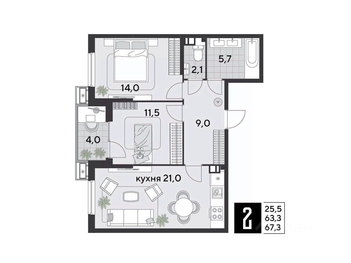 Срок сдачи: 1 кв. 2026, общей площадью 67.3 кв.м., на 6 этаже.