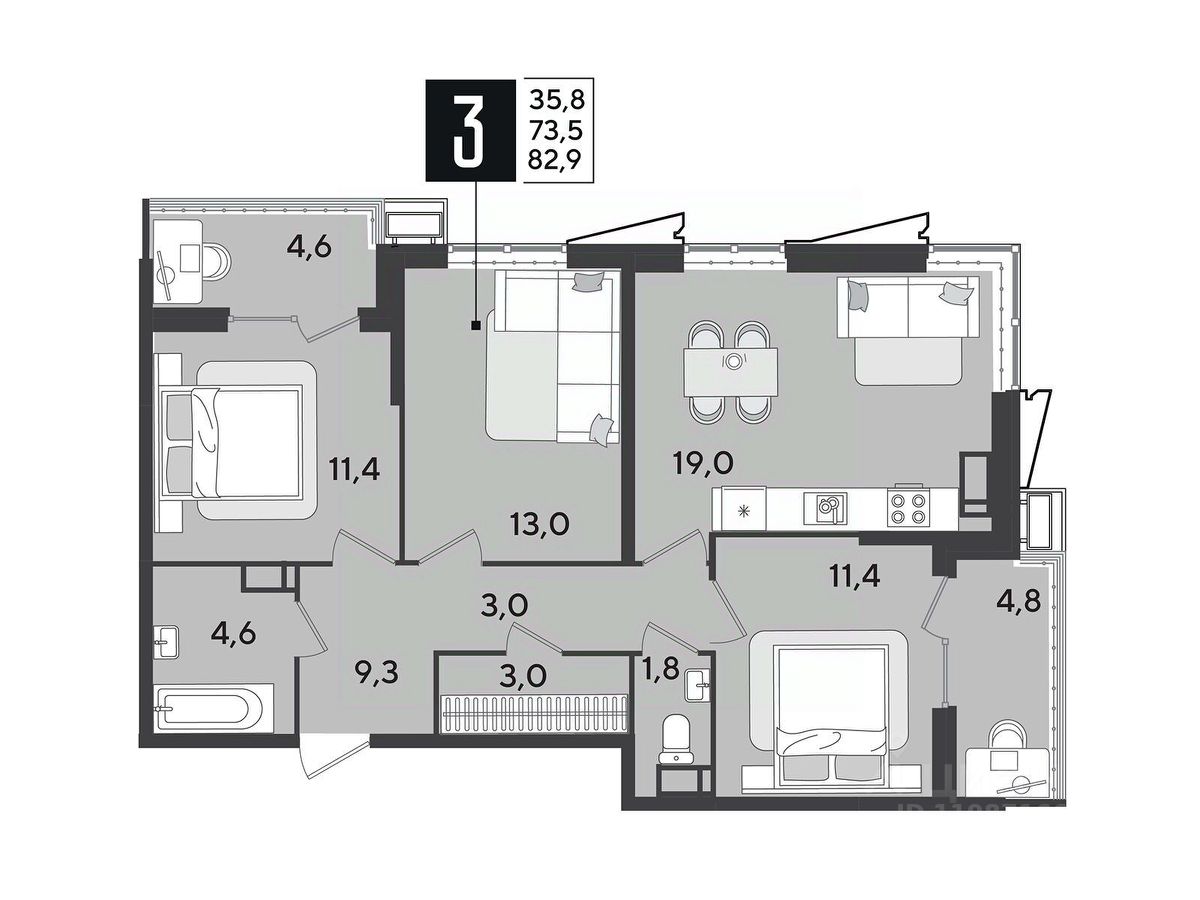 Срок сдачи: 1 кв. 2026, общей площадью 82.9 кв.м., на 17 этаже.