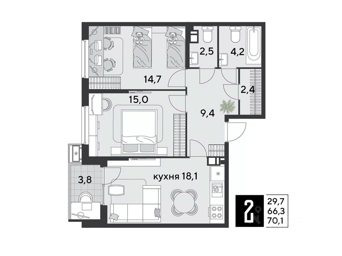 Срок сдачи: 1 кв. 2026, общей площадью 70.1 кв.м., на 7 этаже.