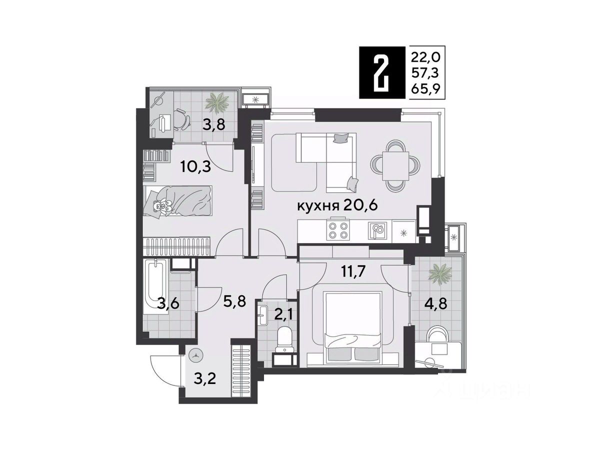 Срок сдачи: 1 кв. 2026, общей площадью 65.9 кв.м., на 13 этаже.