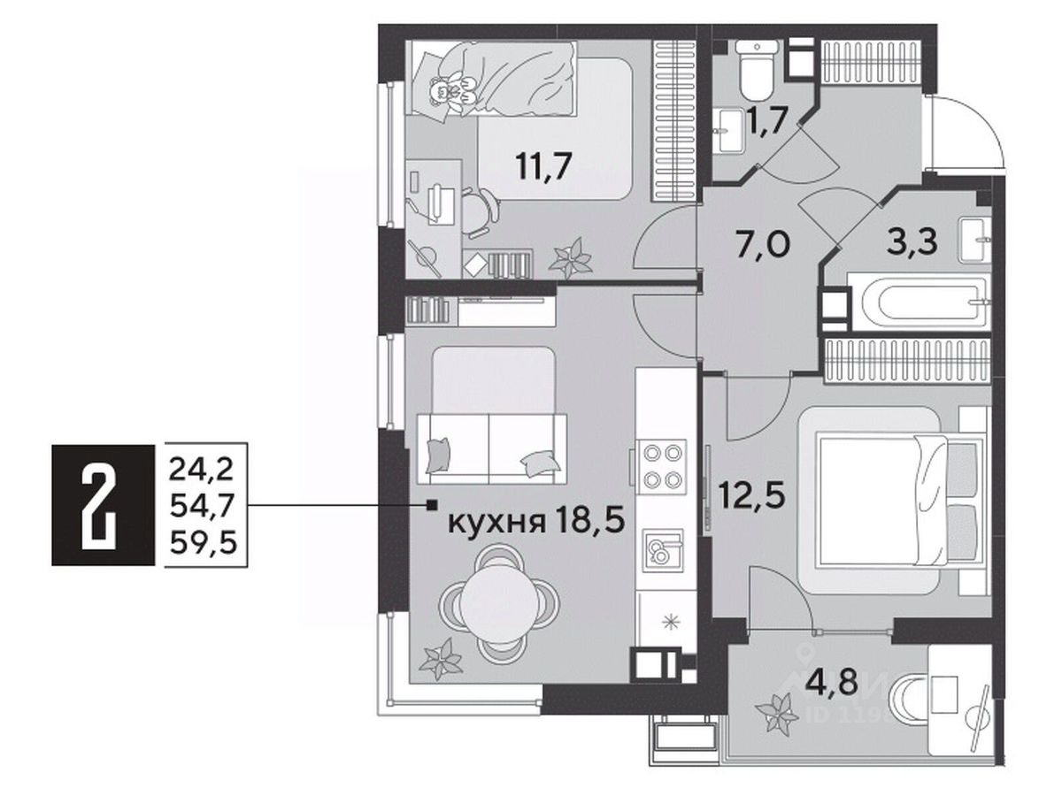 Срок сдачи: 1 кв. 2026, общей площадью 59.5 кв.м., на 6 этаже.