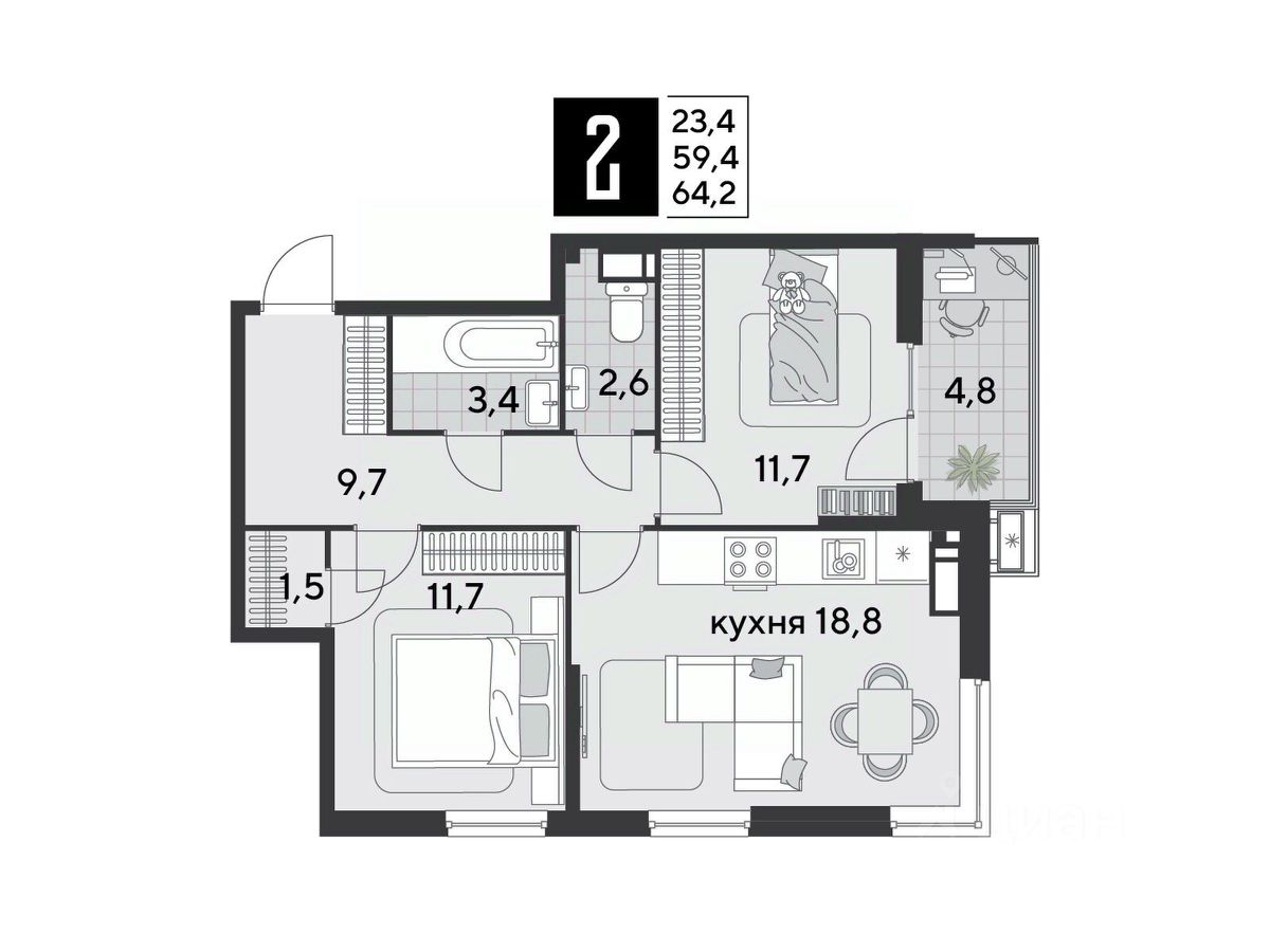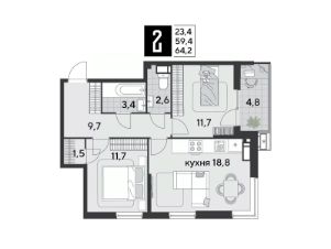 Срок сдачи: 1 кв. 2026, общей площадью 64.2 кв.м., на 11 этаже.