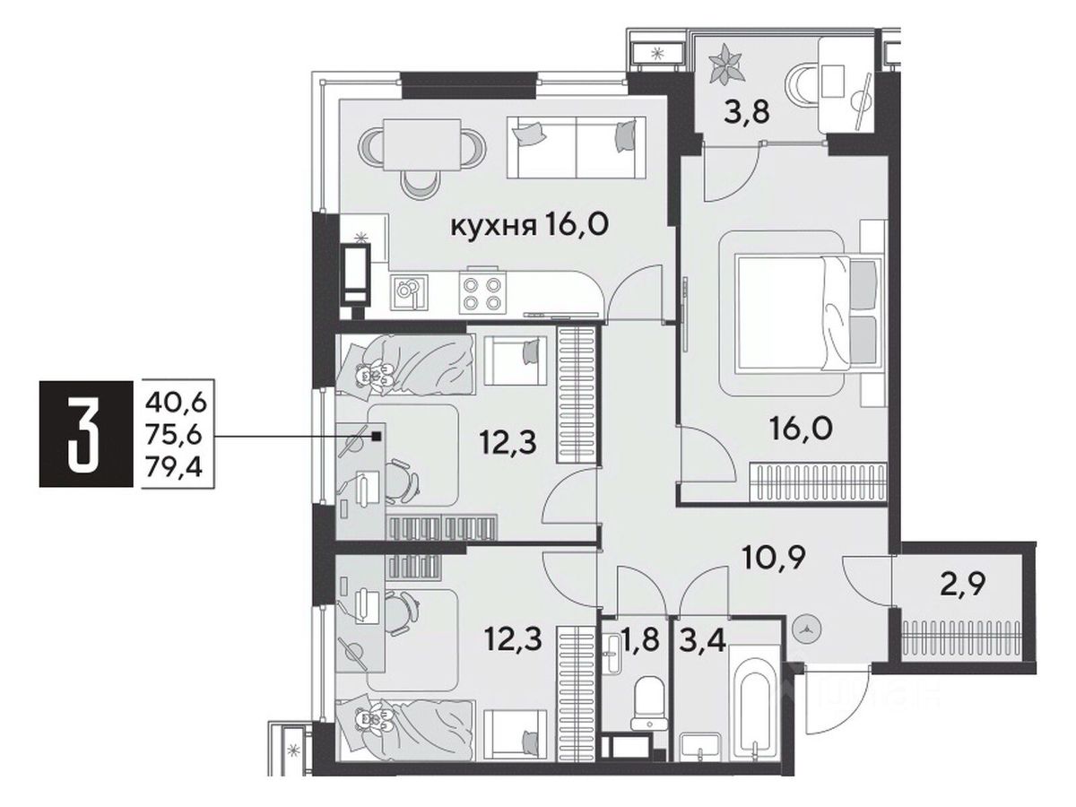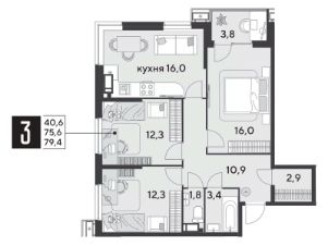 Срок сдачи: 1 кв. 2026, общей площадью 79.4 кв.м., на 18 этаже.