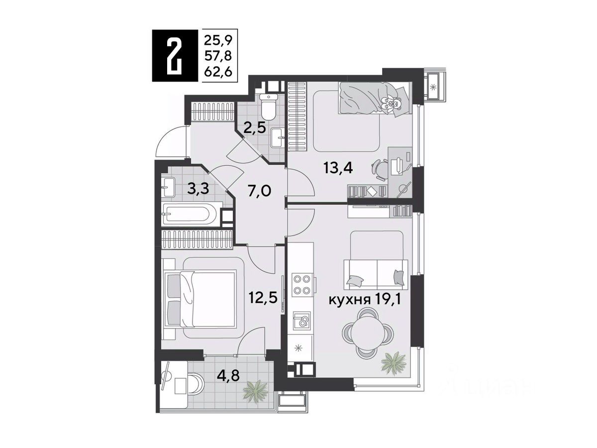 Срок сдачи: 1 кв. 2026, общей площадью 62.6 кв.м., на 8 этаже.