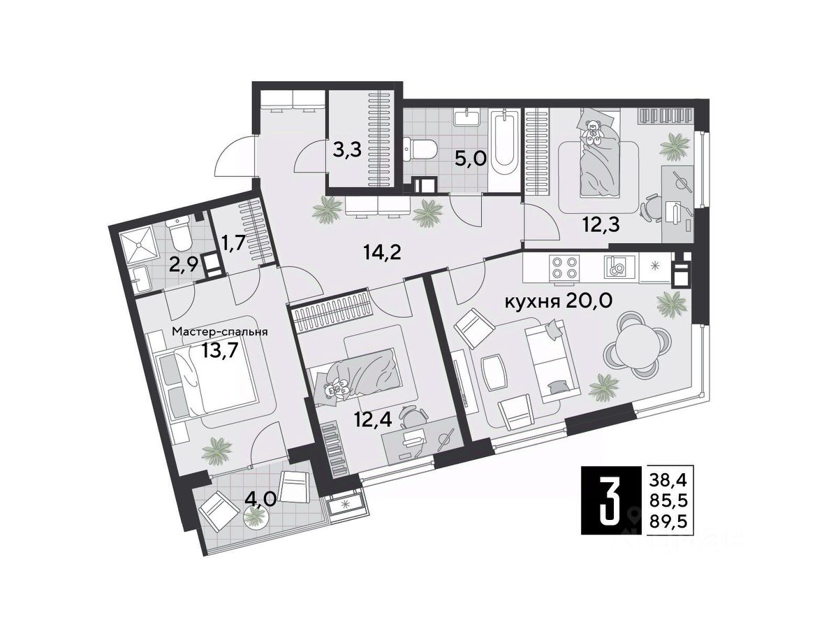 Срок сдачи: 1 кв. 2026, общей площадью 89.5 кв.м., на 9 этаже.