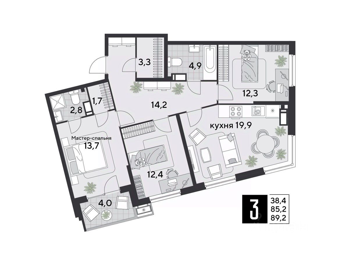 Срок сдачи: 1 кв. 2026, общей площадью 89.2 кв.м., на 10 этаже.