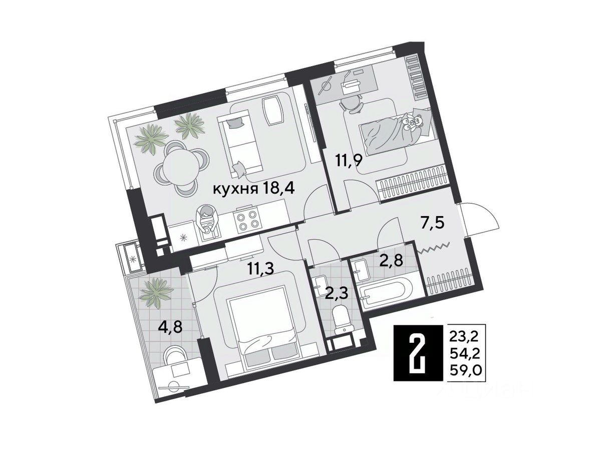 Срок сдачи: 1 кв. 2026, общей площадью 59 кв.м., на 10 этаже.
