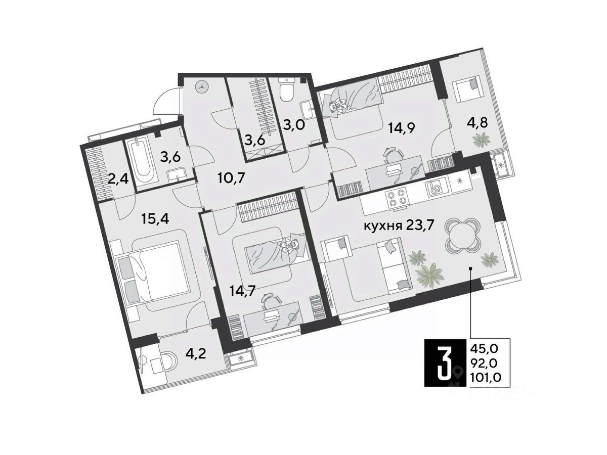 Срок сдачи: 1 кв. 2026, общей площадью 101 кв.м., на 2 этаже.