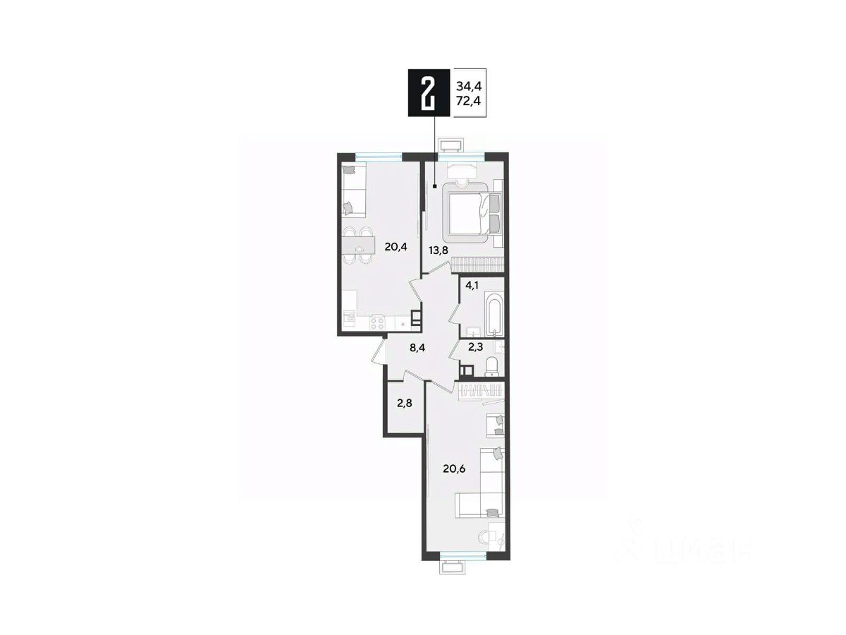 Срок сдачи: 1 кв. 2026, общей площадью 72.4 кв.м., на 8 этаже.