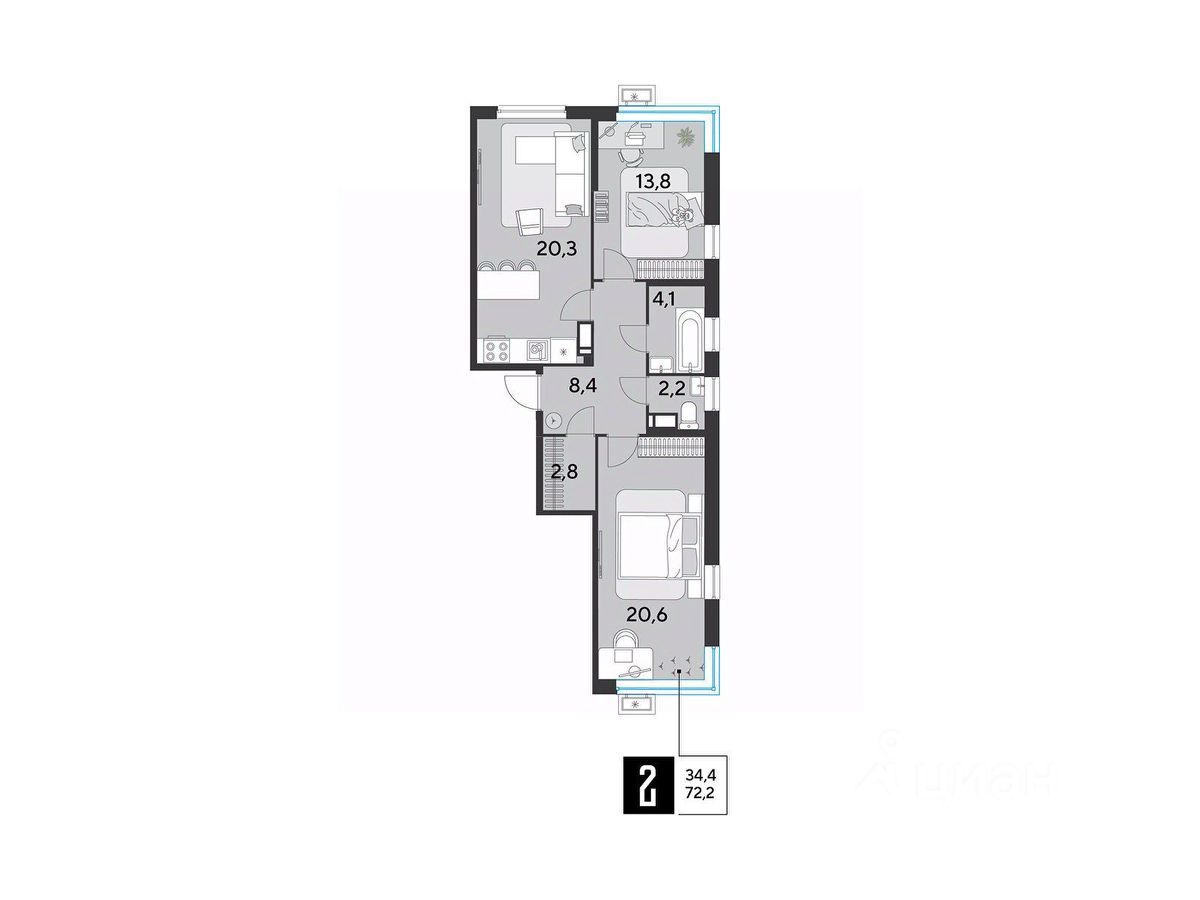 Срок сдачи: 1 кв. 2026, общей площадью 72.2 кв.м., на 10 этаже.