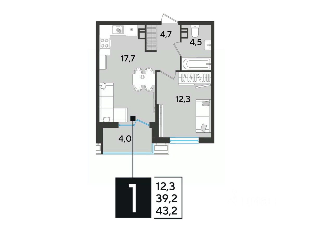 Срок сдачи: 2 кв. 2026, общей площадью 43.2 кв.м., на 9 этаже.