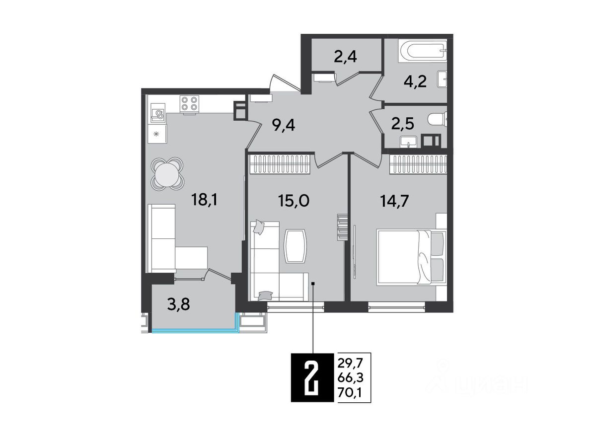 Срок сдачи: 2 кв. 2026, общей площадью 70.1 кв.м., на 6 этаже.