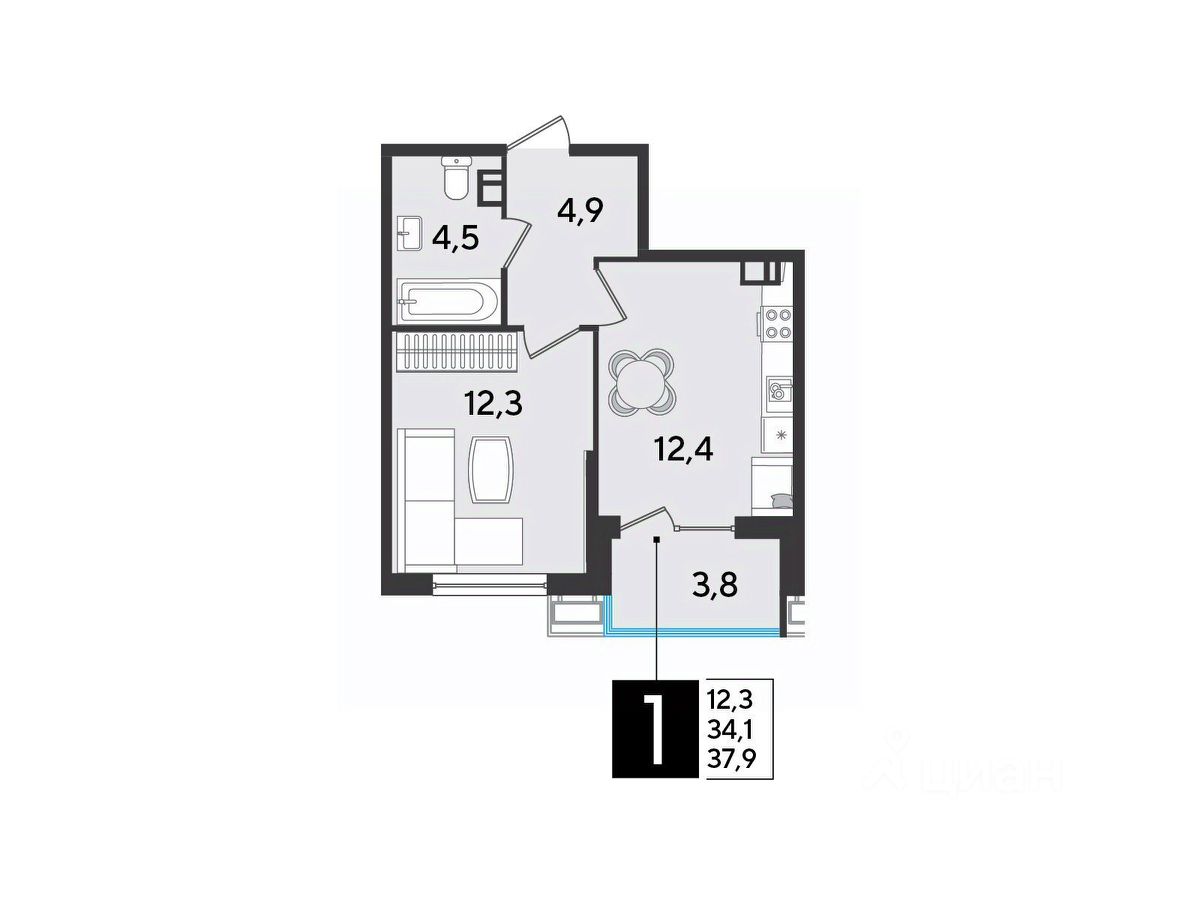Срок сдачи: 2 кв. 2026, общей площадью 37.9 кв.м., на 9 этаже.