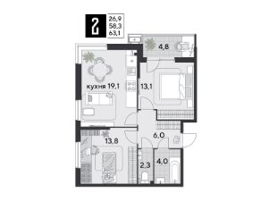 Срок сдачи: 2 кв. 2026, общей площадью 63.1 кв.м., на 2 этаже.