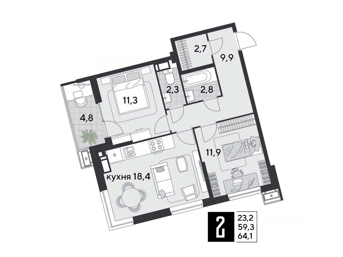Срок сдачи: 2 кв. 2026, общей площадью 64.1 кв.м., на 11 этаже.
