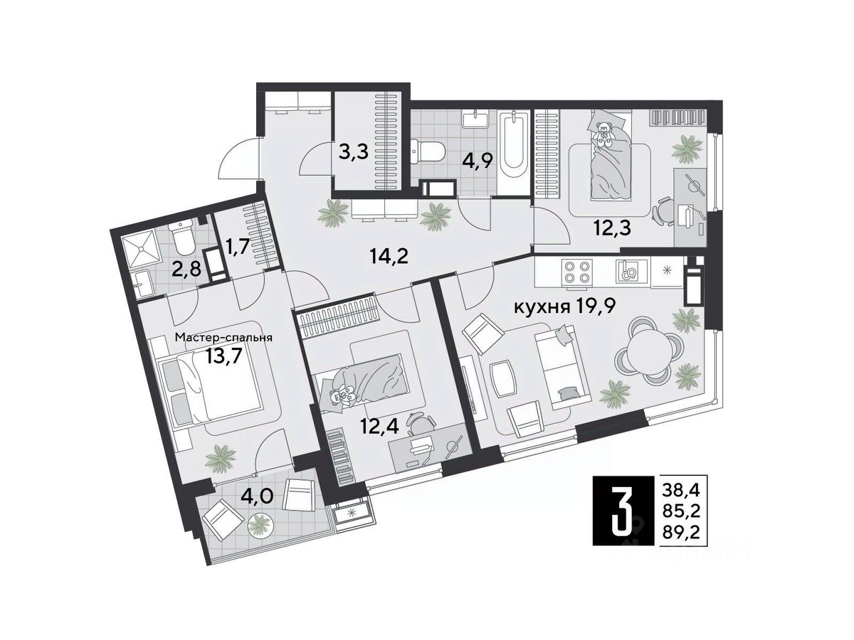 Срок сдачи: 2 кв. 2026, общей площадью 89.2 кв.м., на 13 этаже.