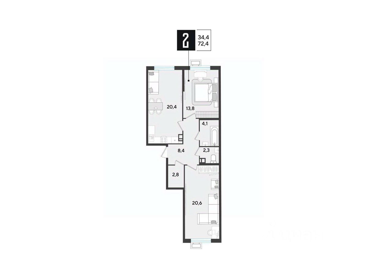 Срок сдачи: 2 кв. 2026, общей площадью 72.4 кв.м., на 2 этаже.