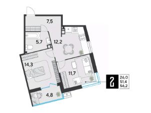 Срок сдачи: 2 кв. 2026, общей площадью 56.2 кв.м., на 8 этаже.