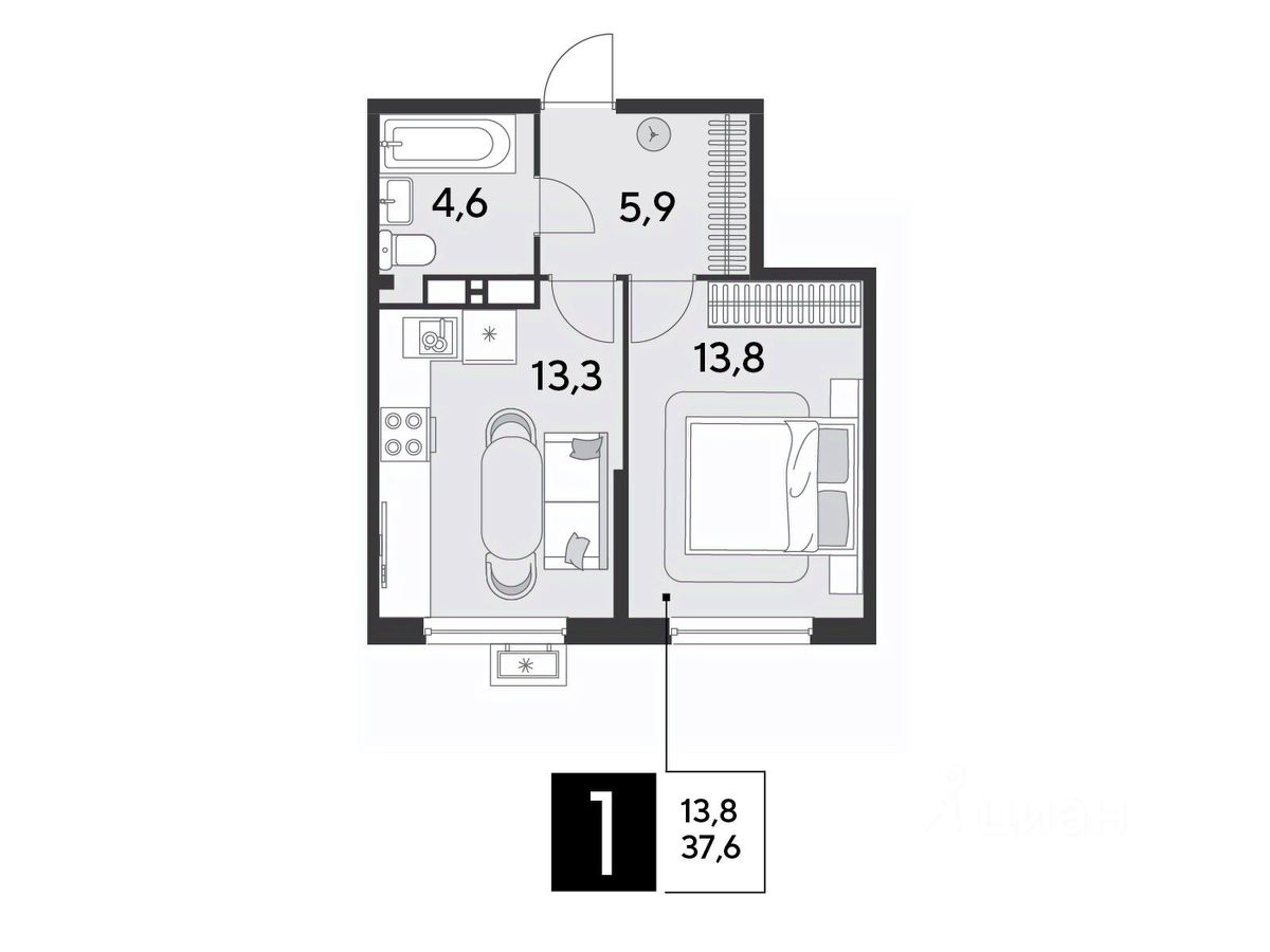 Срок сдачи: 2 кв. 2026, общей площадью 37.6 кв.м., на 14 этаже.