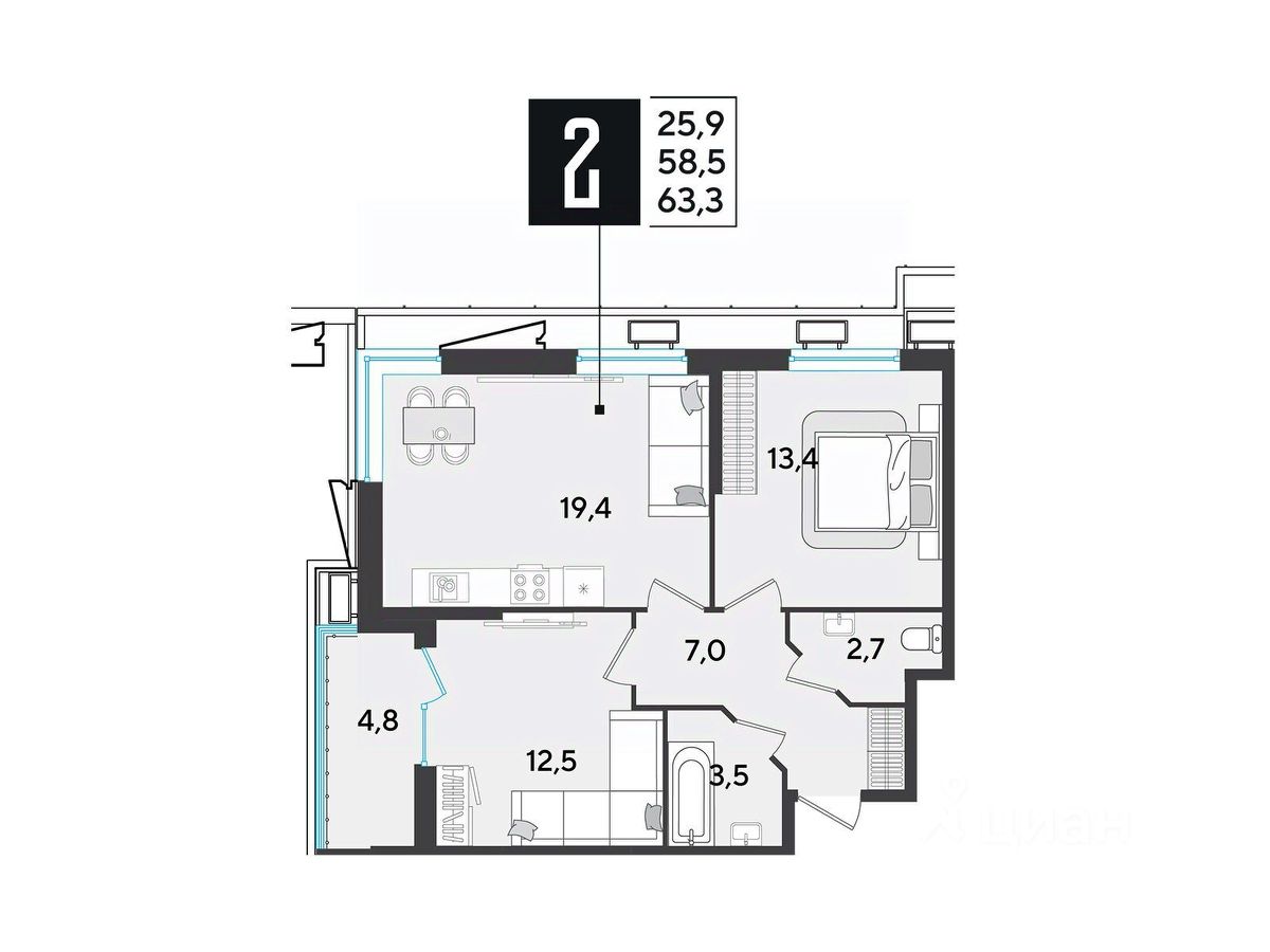 Срок сдачи: 2 кв. 2026, общей площадью 63.3 кв.м., на 2 этаже.