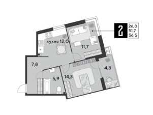 Срок сдачи: 2 кв. 2026, общей площадью 56.5 кв.м., на 2 этаже.