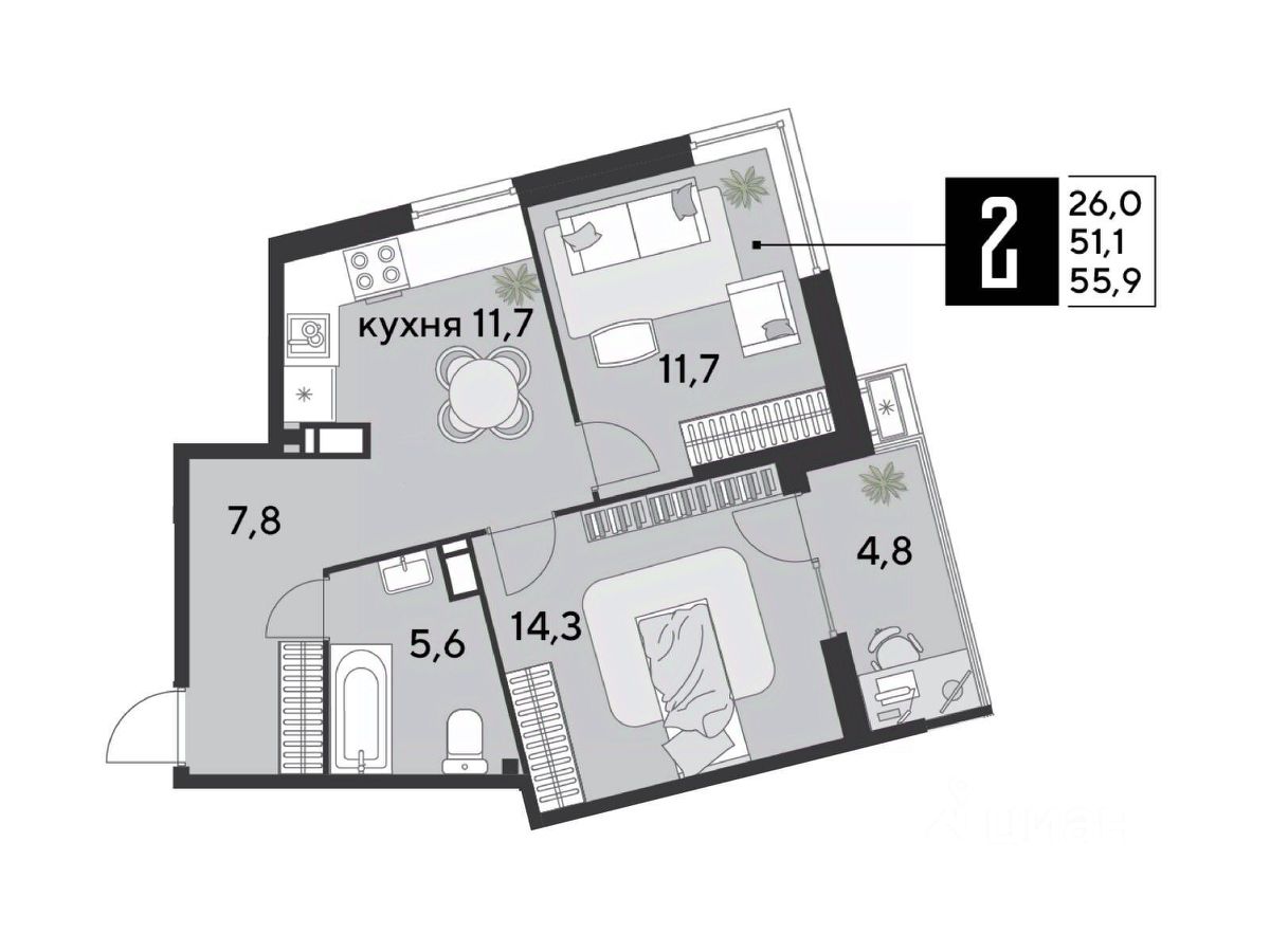 Срок сдачи: 2 кв. 2026, общей площадью 55.9 кв.м., на 12 этаже.