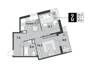 Срок сдачи: 2 кв. 2026, общей площадью 55.9 кв.м., на 16 этаже.