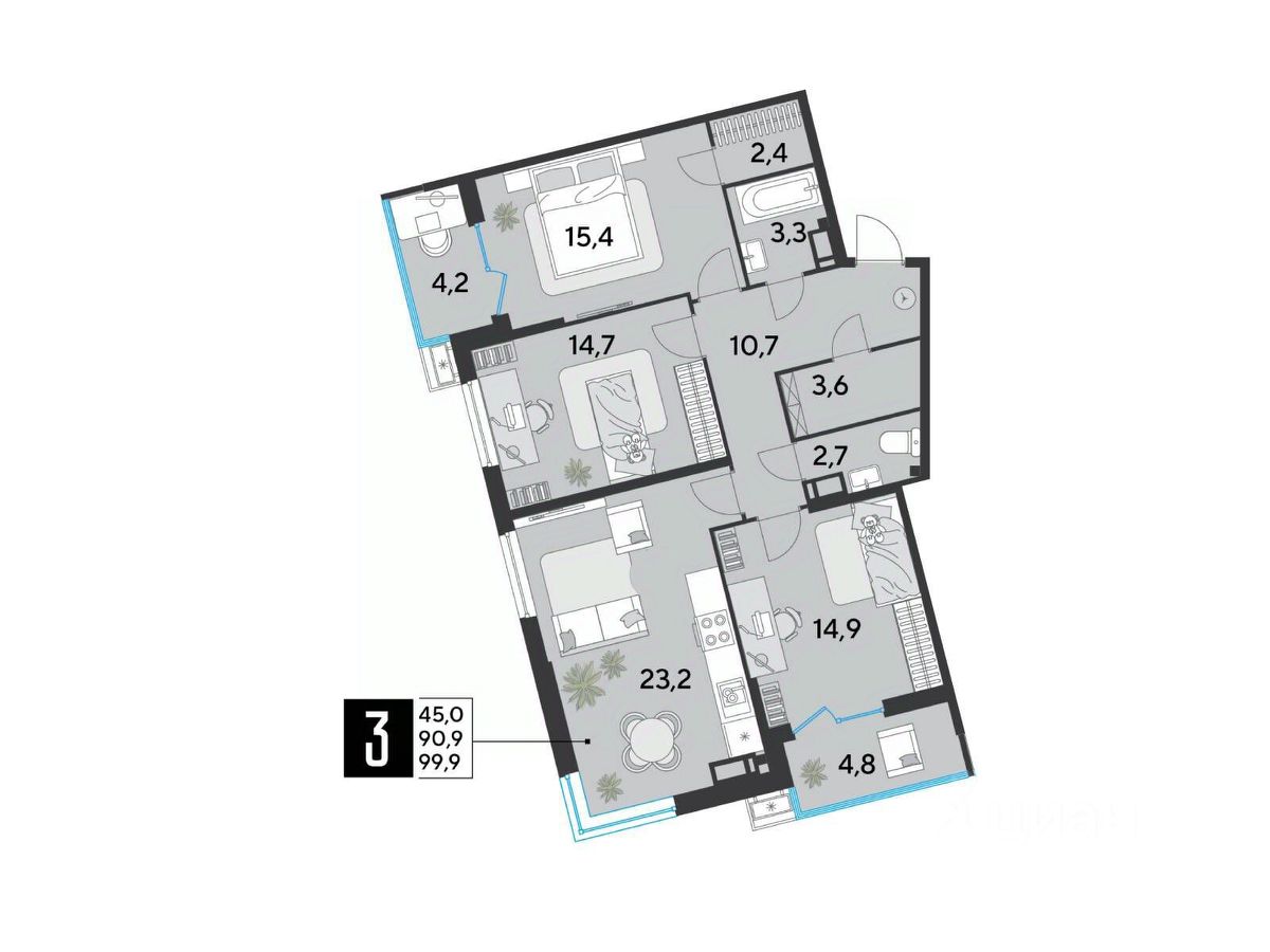 Срок сдачи: 2 кв. 2026, общей площадью 99.9 кв.м., на 16 этаже.