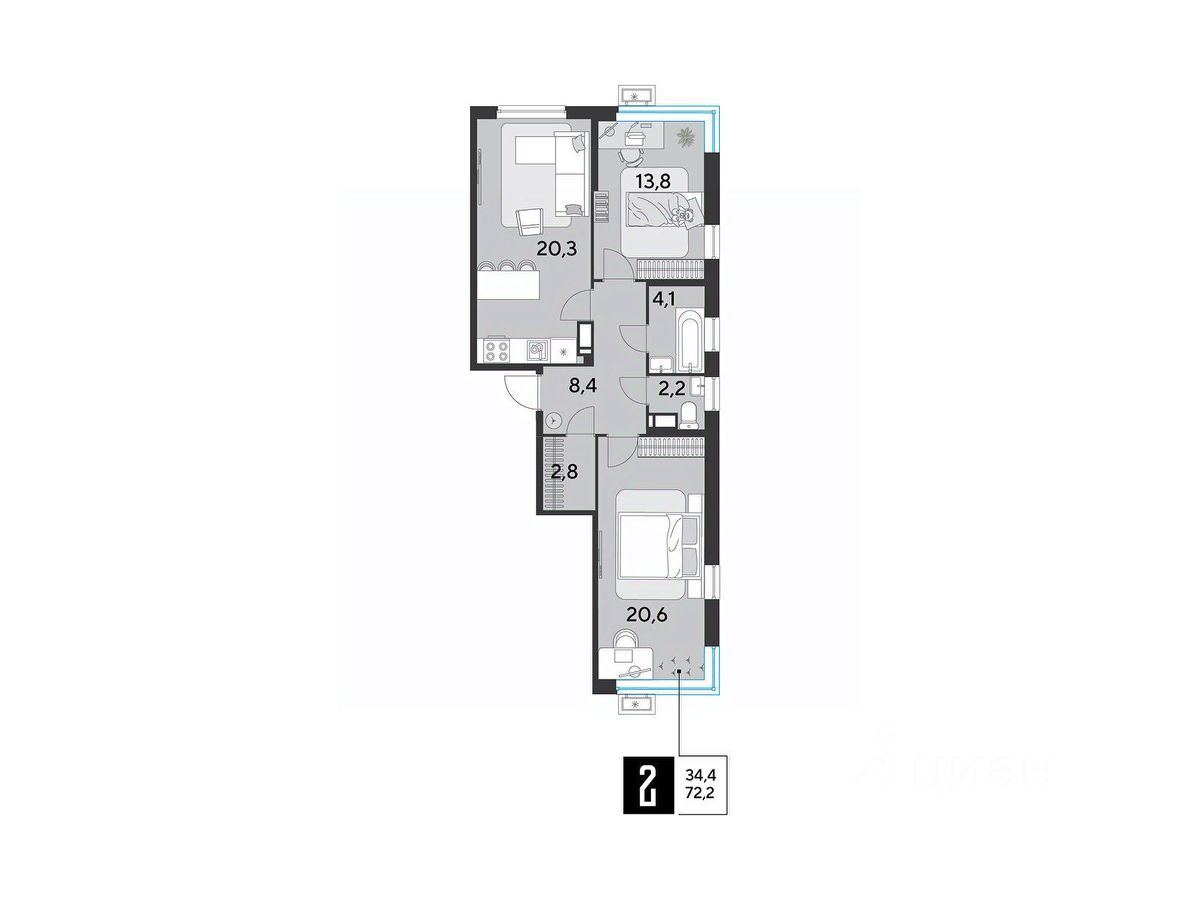 Срок сдачи: 2 кв. 2026, общей площадью 72.2 кв.м., на 14 этаже.