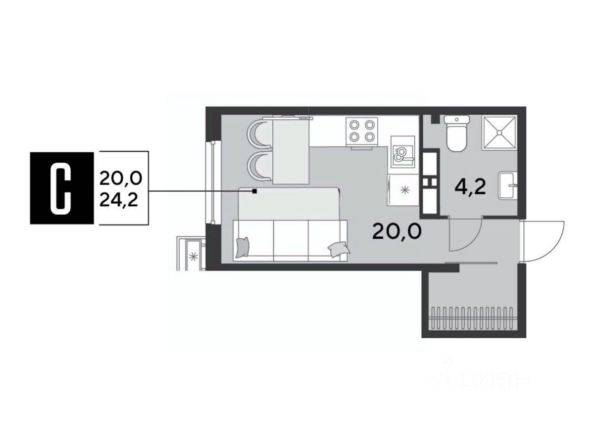 Срок сдачи: 2 кв. 2026, общей площадью 24.2 кв.м., на 12 этаже.