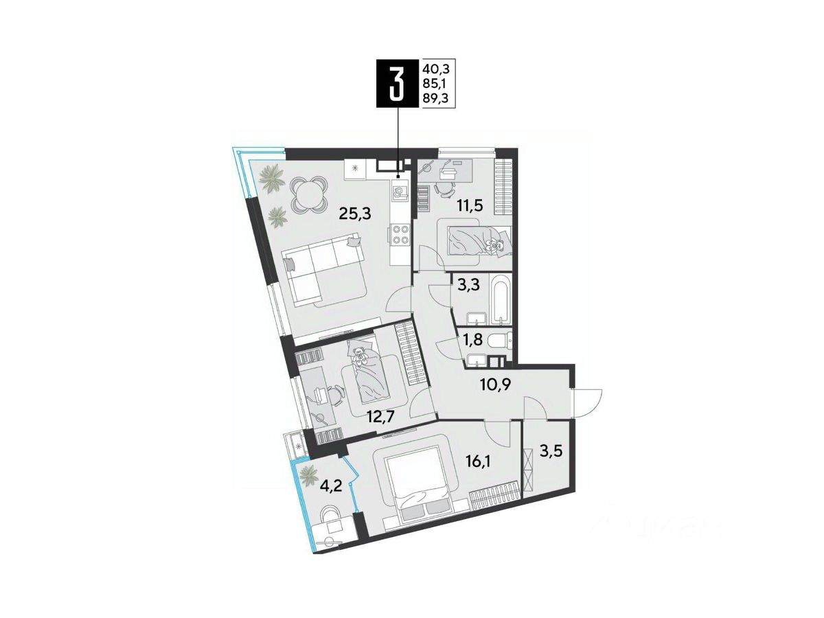 Срок сдачи: 2 кв. 2026, общей площадью 89.3 кв.м., на 13 этаже.