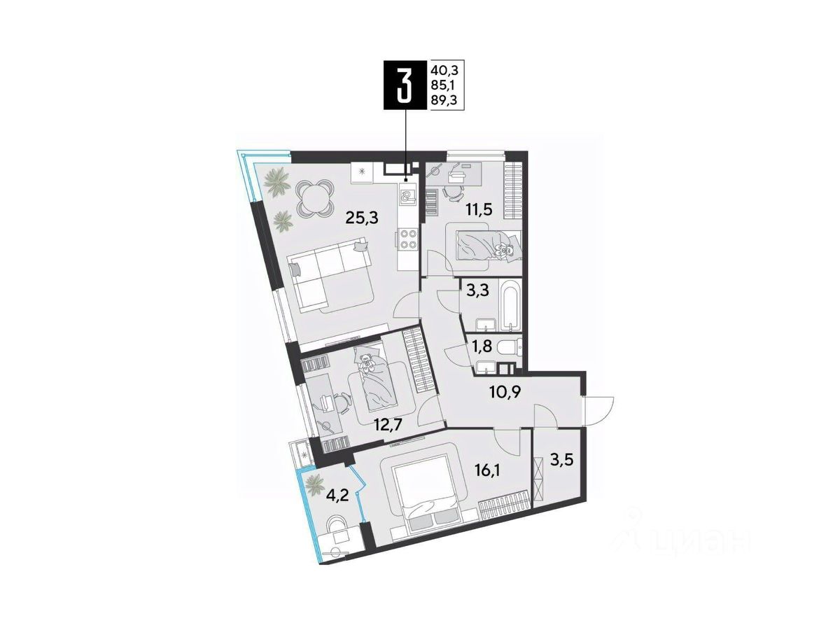 Срок сдачи: 2 кв. 2026, общей площадью 89.3 кв.м., на 11 этаже.